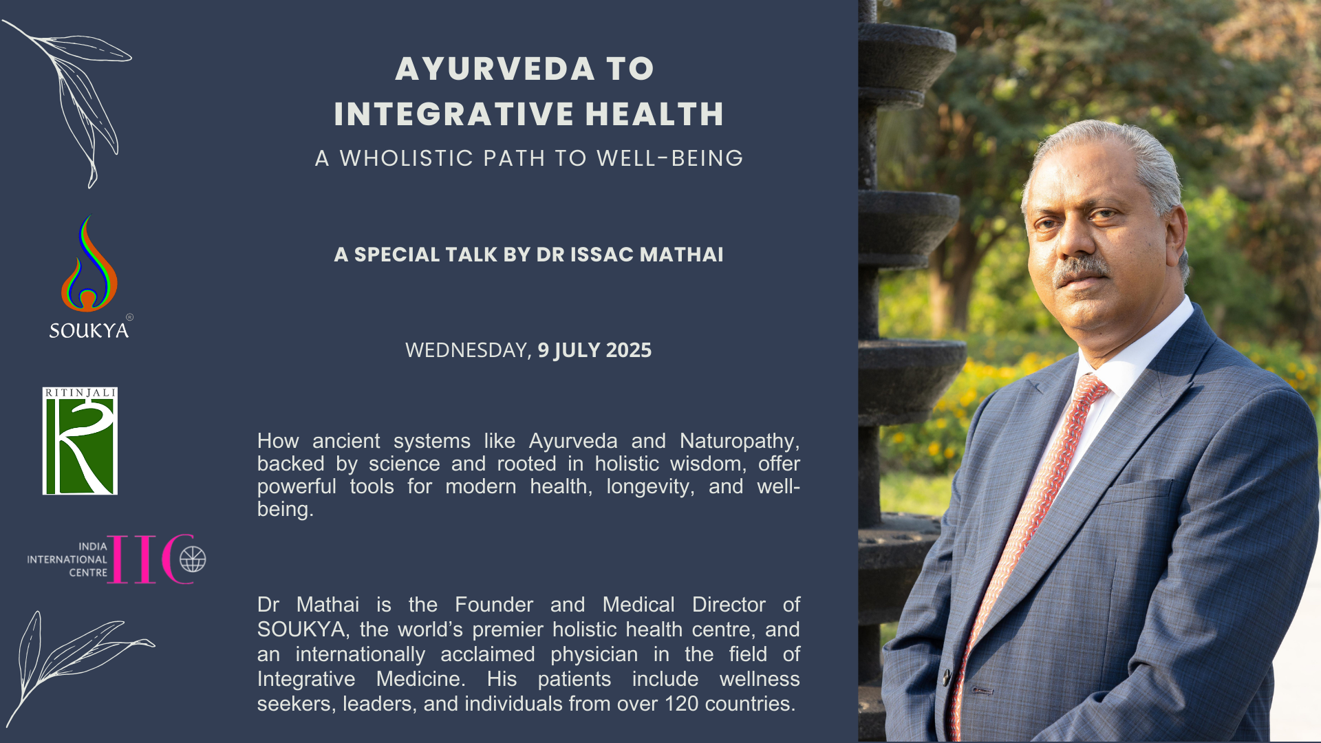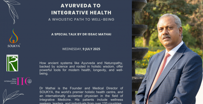 On 9 July 2025, Ritinjali hosted a talk by Dr Issac Mathai on ‘Ayurveda to Integrative Health: A Holistic Path to Well-Being’, in collaboration with SOUKYA, the Centre for Escalation of Peace and the India International Centre. Over 240 participants joined the session, both in person and online.