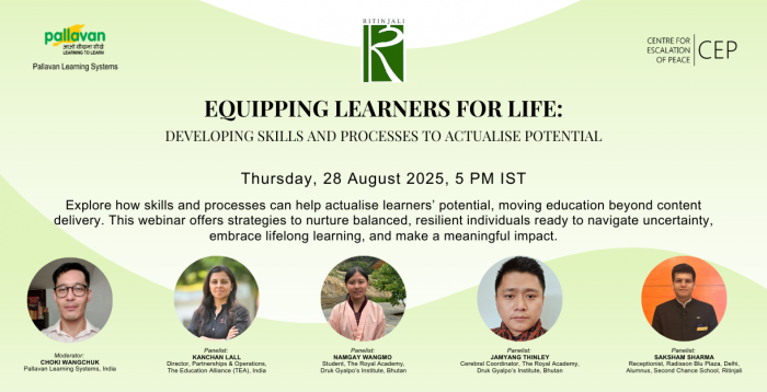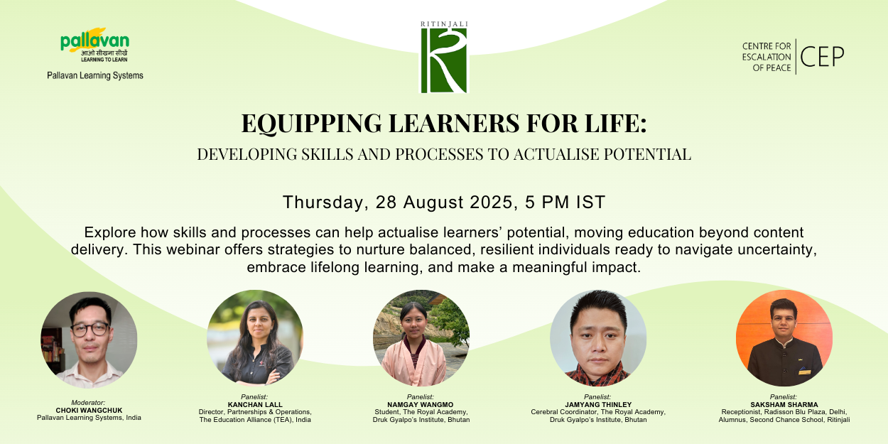 On 28 August 2025 Pallavan Learning Systems hosted a webinar on the theme, ‘Equipping Learners for Life: Developing Skills and Processes to Actualise Potential' in association with Centre for Escalation of Peace and Ritinjali. The session sought to generate and share knowledge on how education systems can evolve to meet the challenges of a rapidly changing world while nurturing learners to lead purposeful, balanced, and resilient lives.